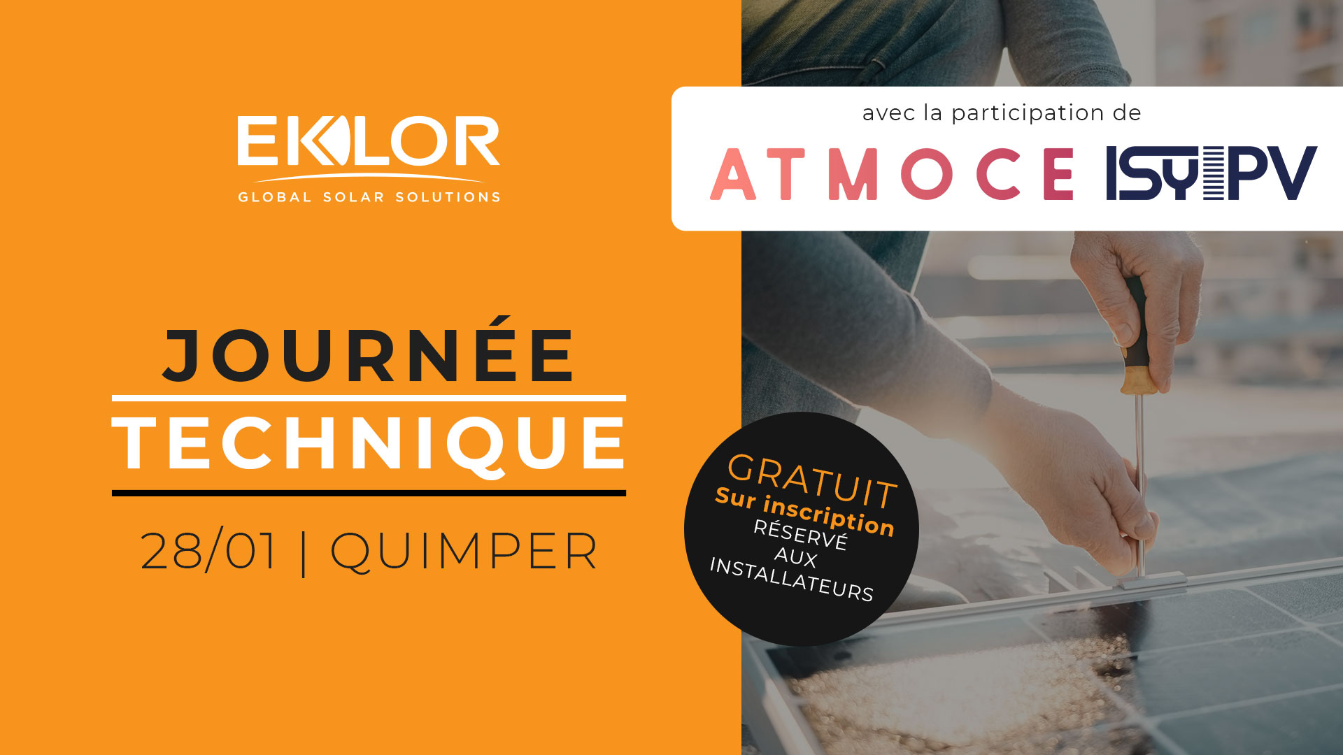 Eklor vous donne rendez-vous à Quimper pour une matinée dédiée aux solutions résidentielles avec ATMOCE, fabricant de micro-onduleurs, batteries de stockage et coffrets, et ISY PV, fabricant de systèmes de fixation avec des procédés certifiés pour le bord de mer.